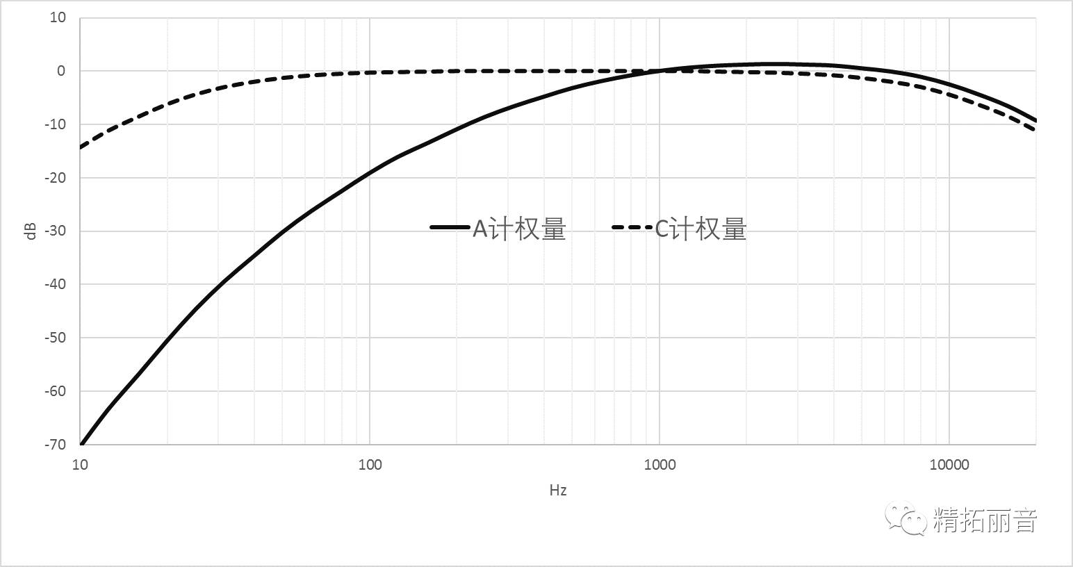 为了更准确的评估复杂声音的强度,声级计里面都加入了计权网络,对各频段声音加权后求和。使用等响曲线近似形状,比如“A”计权就是使用40方等响曲线的近似形状,低频声对总体响度贡献度小,计权系数较低。“B”计权则是使用70方的等响曲线,“C”计权则是使用100方的等响曲线来来加权计算。目前B计权几乎不用,使用最多的是A计权方式的测量,单位为dBA或dB(A)。下图是A,C计权曲线。