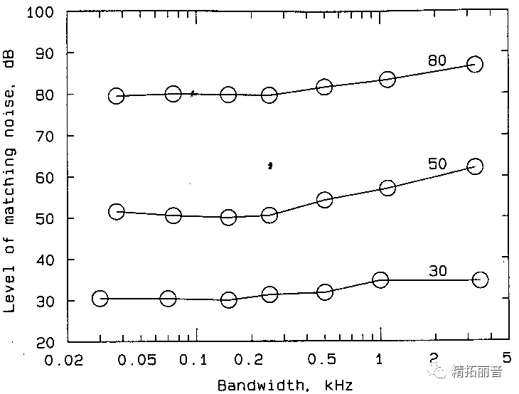 图4. 两噪声响度匹配时,带宽恒为210Hz的噪声的声压级相对于可变带宽噪声的带宽的函数图,噪声信号的中心频率均为1420Hz。每个曲线的标号为用dB表示的可变带宽噪声的总体声压级。