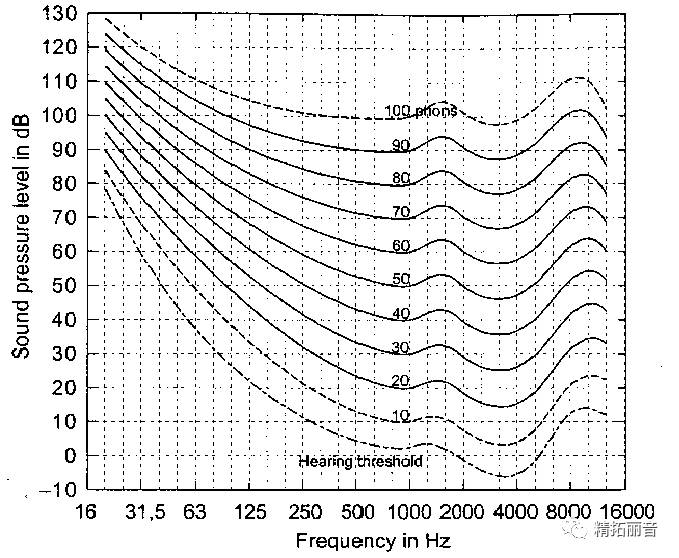 这样就导致一个问题,现场录制的音乐,重放时除非重现原始现场的声压级,不然音调就有稍许变化。很直观的一个例子,当音量调小时,最先感知不到的是低频的声音。比如1000Hz和100Hz的纯音都从80dB下降到60dB,1000Hz的响度级从80方降到60方,下降20方,而100Hz的响度级则从60方下降到34方,下降了26方,所以小的便携音箱往往将低频稍微加重,听起来声音才会均衡一点。很多功放里面也集成响度控制,随着音量提高低音,当然,这样的响度控制还是有其局限性,没有考虑听音者的距离和房间的影响。