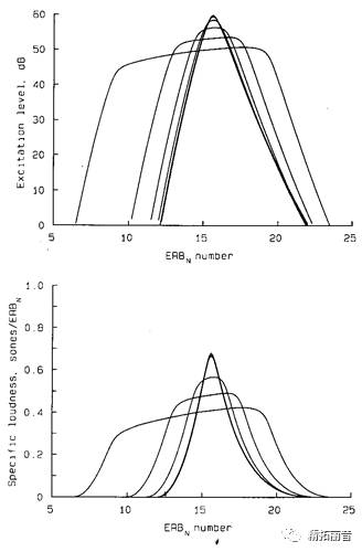 图5是一个正弦信号的刺激模式和比响度模式,并用了声压级为60dB的、带宽不同的的噪声,采用了Moore的模型进行计算的。随着带宽的上升至CBL,“比响度”模式的尖端变低,但是变宽,顶端的减少可以用两边的增加来弥补,而整个形状的总面积保持着几乎是一个恒值。当带宽上升到超过CBL,两边的增加要比顶端的减少的大的多了,这时总面积增加了,所以表示的响度也提升了。既然响度的提升有赖于不同特征频率下的“比响度”的叠加,所以通常用“响度叠加”来描述响度的增加。