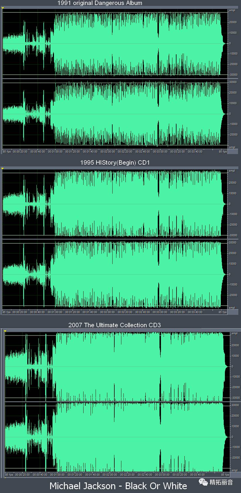 下图是麦克·杰克逊的《Black Or White》在不同年代发行的版本的对比。年代越近发行的音乐,其幅度越大。