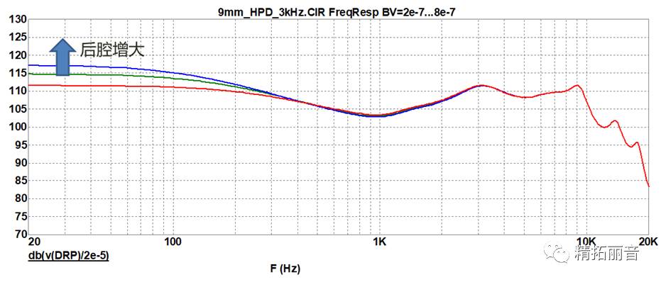 改变后腔大小对频响曲线的影响 (按照箭头方向,后腔逐渐增大)