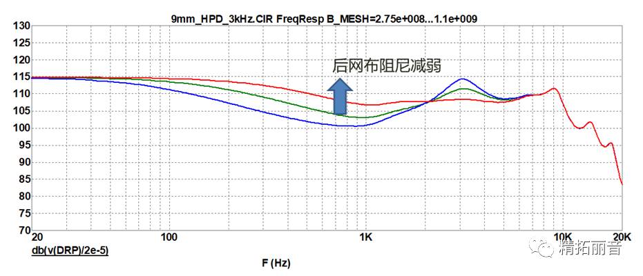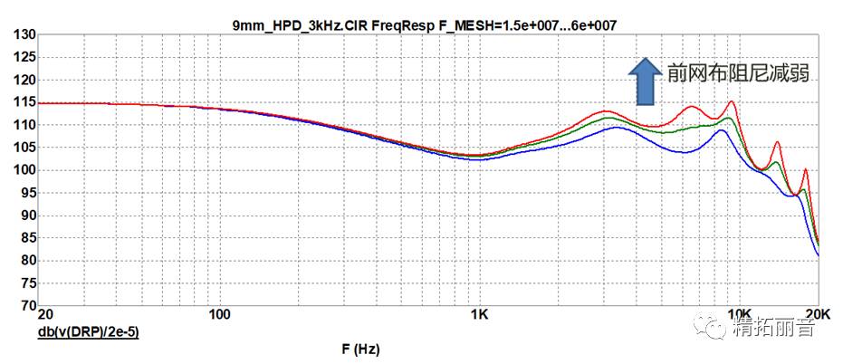 改变后网布阻尼对频响曲线的影响 (按照箭头方向,网布阻尼逐渐减弱)