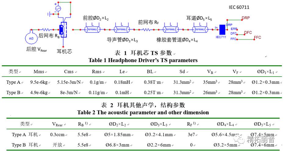 在仿真模型中,建立了两套耳机芯模型,不同的TS参数和管道参数,具体参数如下图所示