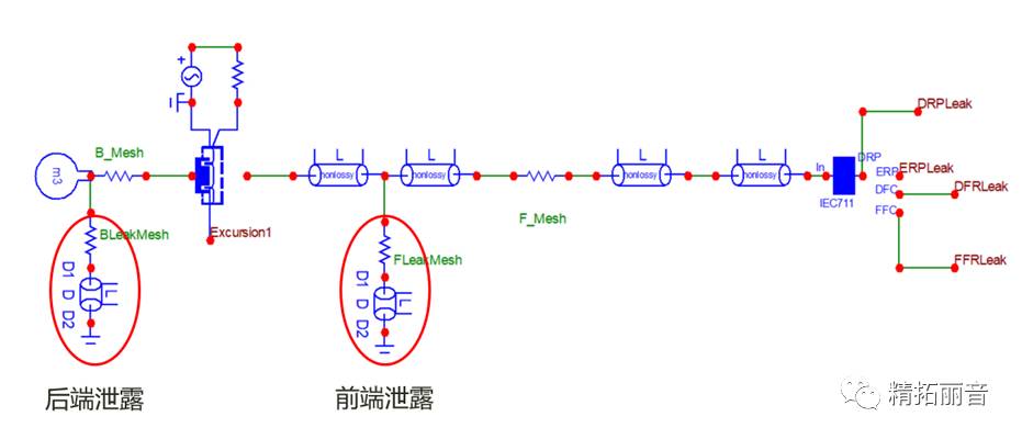 其中,耳机芯为依照图6中耳机芯模型建立起来的宏。在耳机芯的后部贴有后网布,后部的体积速度经过后网布终止于后腔。耳机芯前部的体积速度,经过前腔,前管道,前网布,通过橡胶套耦合到IEC711的耳道里。