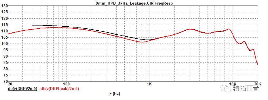 无泄漏设计的耳机,在佩戴过程中,会对耳膜产生较强的压迫感。就出现了平衡泄漏设计,如图所示,分别在前腔和后腔增加微孔并贴厚实的网布,得到的仿真结果如下图。