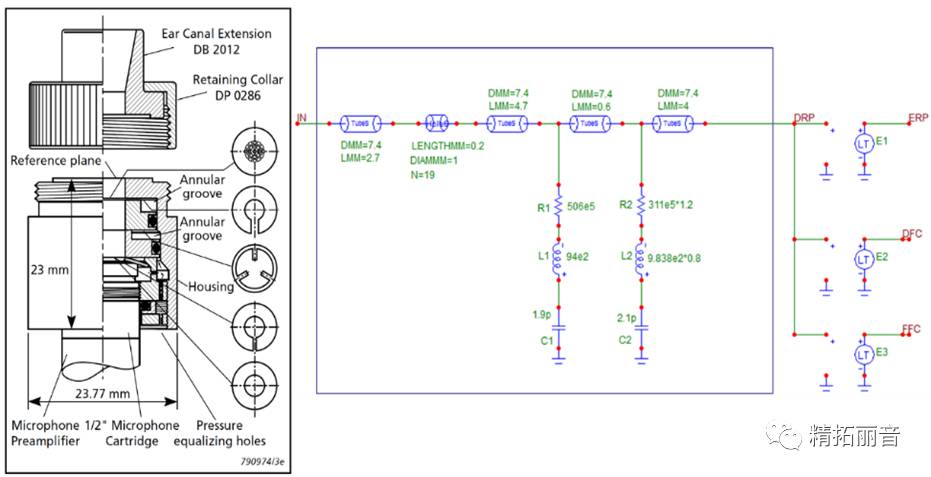 这里所有的仿真都是基于Spectrum Software公司出的MicroCAP 11 电路仿真软件,里面集成了KTI建立的声学库。下面讨论的是在这个声学库的基础上,如何组建一个完整的入耳式耳机的声学仿真模型,并和实际测试结果对比。